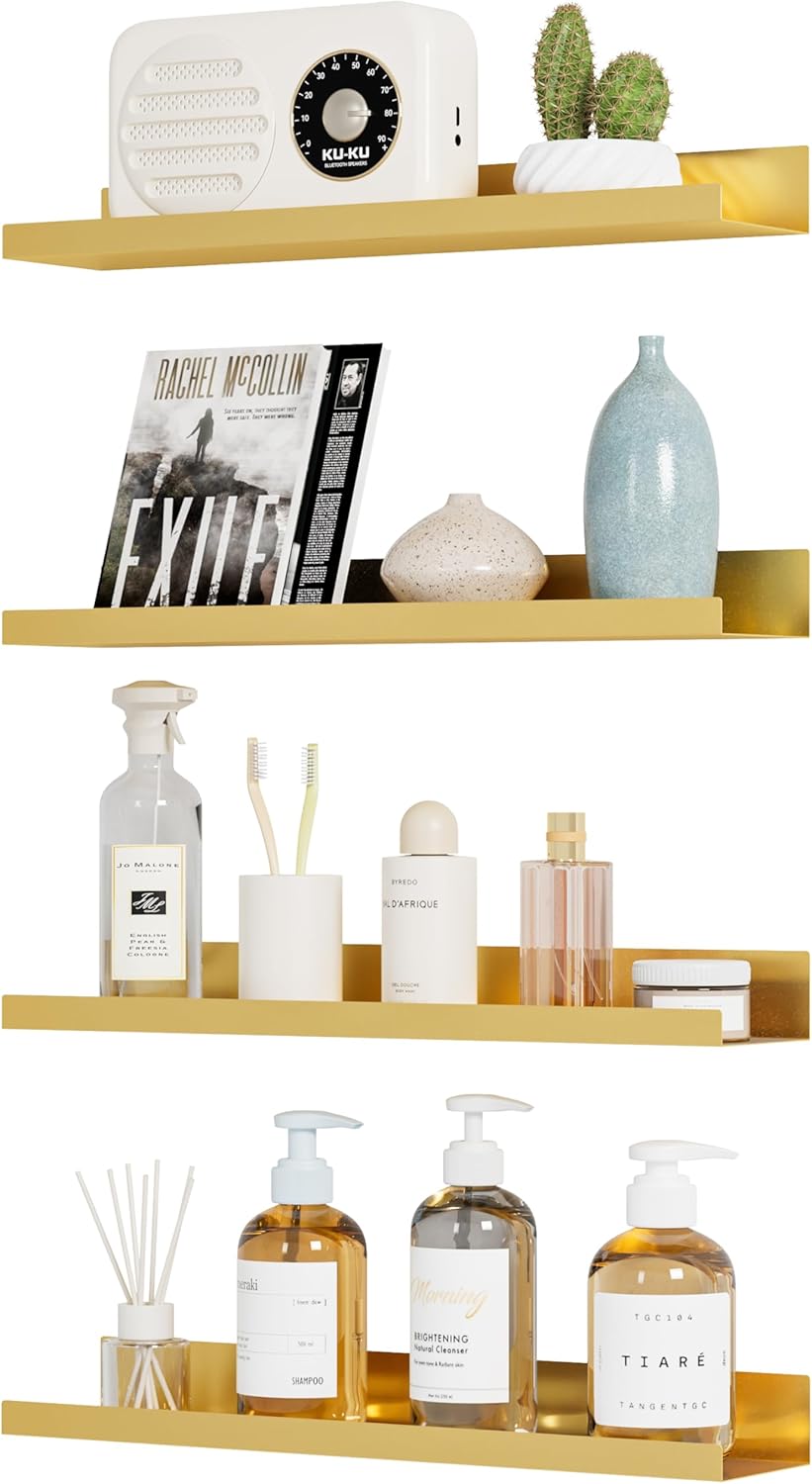 4 Pack Metal Floating Shelves for Wall Storage. Gold Hanging Shelves for Living Room/Kitchen/Bedroom/Bathroom Decor. Set of 4 Organizer for Display. Book & Perfume Shelf Wall Mounted